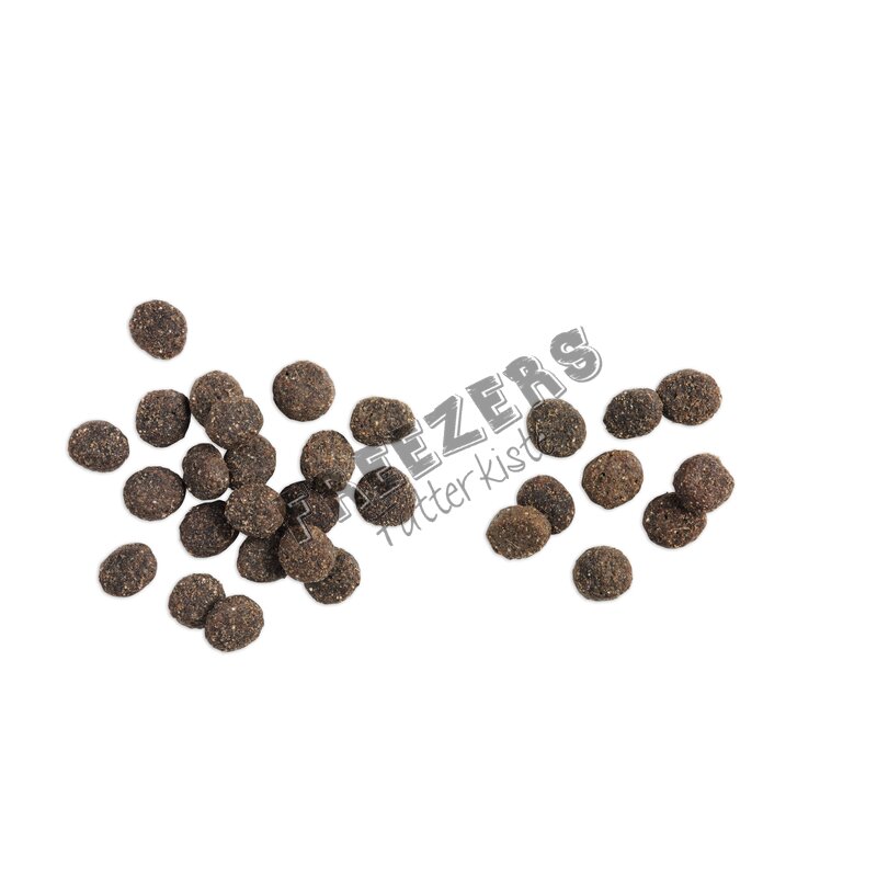 Geflügelprotein, getrocknet (16 %); Mais; Hafermehl aus geschälter Saat; Erbsenmehl; Fischmehl aus Meeresfischen (8 %); Maisfuttermehl; Geflügelfett; Rübentrockenschnitzel, entzuckert; Bohnenmehl (Vicia faba); Bierhefe, inaktiviert, getrocknet (2,5 %); Johannisbrotschrot, getrocknet; Lachsöl (1,5 %); Geflügelleber, hydrolysiert; Dicalciumphosphat; Leinsaat (1,1 %); Natriumchlorid; Kaliumchlorid; Kräuter, getrocknet (Brennnesselblätter, Enzianwurzel, Tausendgüldenkraut, Kamille, Fenchel Kümmel, Mistelkraut, Schafgarbenkraut, Brombeerblätter) (0,2 %); Yucca schidigera (0,025 %)