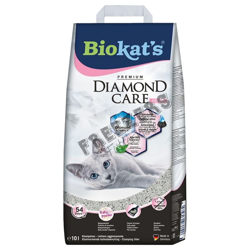 Biokat´s DIAMOND CARE Fresh Katzenstreu ist eine klumpende, innovative Naturtonstreu mit Aktivkohle für eine hochwirksame Geruchsbindung und Saugfähigkeit. Diese wird aus Kokosnuss-Schale, einem nachwachsenden Rohstoff gewonnen. Aktivkohle ist ein hochporöser Kohlenstoffkörper mit einer enormen inneren Oberfläche, ein Gramm Aktivkohle ergibt etwa 1.000 qm Oberfläche. Im Zusammenspiel mit physikalischen Kräften können Gerüche hochwirksam gebunden werden. Zusätzlich ist Biokat´s DIAMOND CARE Fresh Katzenstreu mit einem Babypuderduft ausgestattet.