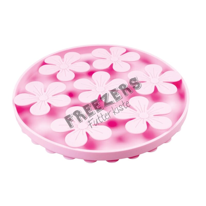 Anti-Schling-, Schleck- und Schnüffelmatte für Hunde. Die „Blüten“ dieser Silikonmatte verhindern dass der Hund seine Mahlzeit, seine Snacks oder die Hundeleberwurst hineinschlingt. Er muss zwischen den Blüten, die ihm alle beim Fressen im Weg sind, suchen. Einzelne Snacks muss er dazu zuvor erschnüffeln. Das beschäftigt den Hund für längere Zeit und erlaubt ein langsameres, gesünderes Fressen. Und weitere Abwechslung ist durch ein anderes Futter jederzeit möglich.