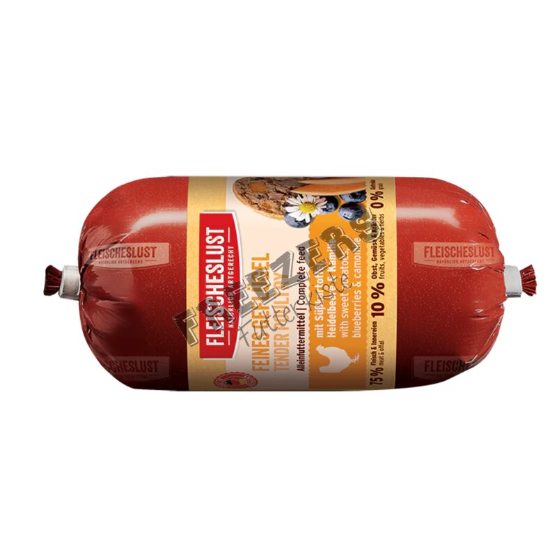 Unser Feines Geflügel mit Süßkartoffel, Heidelbeere & Kamille besteht aus 75 % feinstem Fleisch und Innereien vom Huhn. 10 % leckeres Obst, knackfrisches Gemüse und wertvolle Kräuter, ergänzt durch hochwertiges, an Omega-3-Fettsäuren reiches Rapsöl, machen unser Alleinfuttermenü natürlich artgerecht.