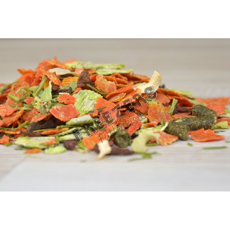 Möhrenflocken,Erbsenflocken,Rote Bete,Petersilienstängel,Lauch, Kräutermischung,Brennesselblätter-Karotten-Selleriestengel-Kamillenblüten-Fenchel-Kümmel-Schafgarbenkraut-Brombeerblätter-Leinsamen-Mistelkraut-Kalmuswurzel-Rhabarberwurzel-Tausendgüldenkraut-Enzianwurzel.