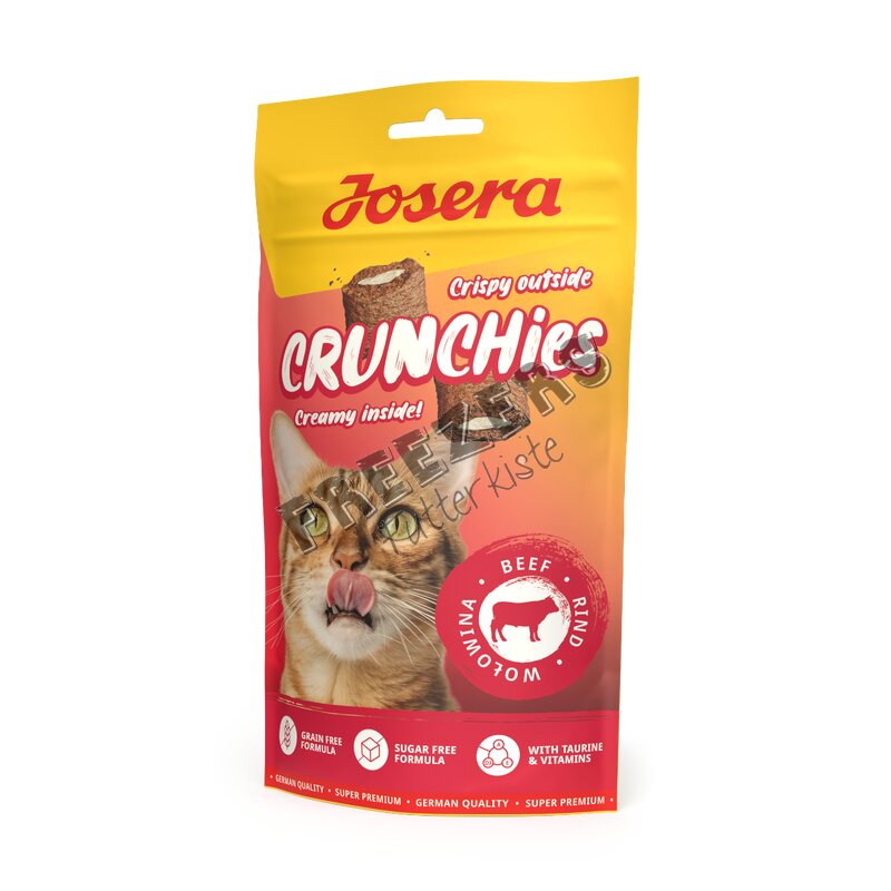 Unsere Josera Crunchies Beef sind so knusprig, dass man fast nicht glauben kann, wie cremig-lecker sie gleichzeitig sind! Die knackigen Kissen mit Rind sind bald schon der neue Lieblingssnack Deiner Katze – und das jeden Tag dank der kalorienarmen, getreidefreien Rezeptur. Außen begeistern die Leckerlis für Katzen mit einer knackigen Hülle und innen wartet eine cremige Füllung darauf, gefuttert zu werden.