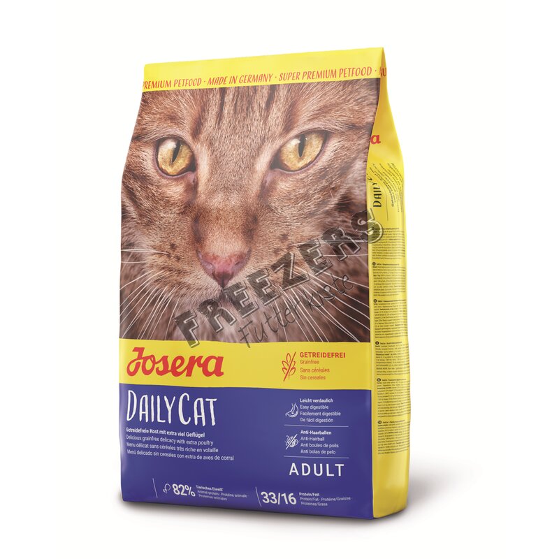 JOSERA DailyCat eignet sich für die tägliche Ernährung von Indoor- und Outdoorkatzen, die getreideempfindlich sind und köstliches Geflügel in ihrem Menü bevorzugen. ? Die tägliche Extraportion an leckerem Geflügel nach Geschmack Ihres Stubentigers (entspricht etwa 130?g Frischfleisch pro 100?g Trockenfutter) ? Wertvolle Fettsäuren, Vitamine und Spurenelemente sorgen für eine gesunde Haut und glänzendes Fell ? Erlesene Kräuter und gesunde Früchte runden die Rezeptur ab und bieten Ihrer Katze eine leckere Abwechslung ? Mit speziell diätetischen Fasern, die der Haar ballen bildung entgegenwirken können