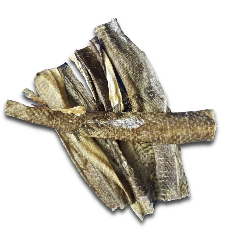 Schonend getrocknete Haut vom Kabeljau mit etwa 8-15cm Länge.