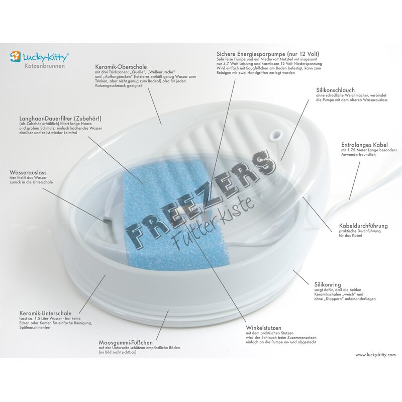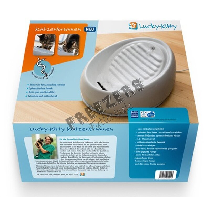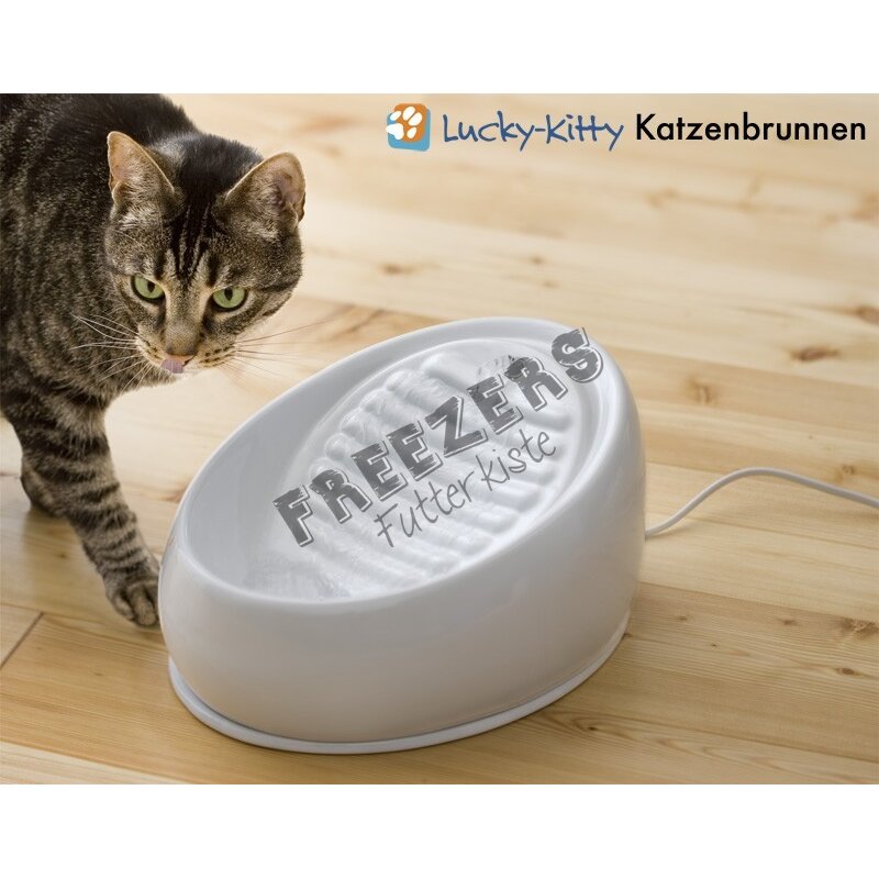 Animiere Deine Katzen dazu genug zu trinken und überrasche sie mit dem Lucky-Kitty Katzenbrunnen. Der Lucky-Kitty Katzenbrunnen aus Keramik ist bei Mensch und Katzen sehr beliebt. Er wurde für den sicheren Dauerbetrieb im Alltag entwickelt - der Katzenbrunnen ist extrem einfach und blitzschnell gereinigt, da er aus Keramik gemacht ist, er hat eine super leise, energiesparende Qualitätspumpe und er kann auch von kräftigen Katzen nicht verschoben, umgeworfen oder geöffnet werden.