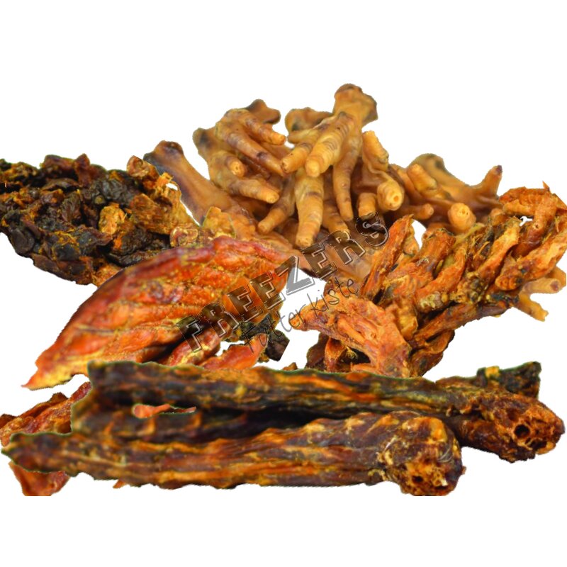 getrocknet, bestehend aus diversen Naturkauartikeln vom Geflügel, unter anderem Putenhälse, Hähnchenbrust, Hühnerfüße, Hühnerflügelspitzen, Entenmägen