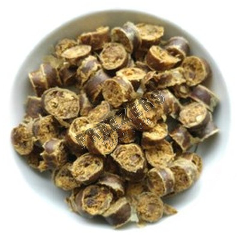 Die Wurstscheiben sind aus eigener Herstellung und ein besonderer Leckerbissen für ihren Hund.