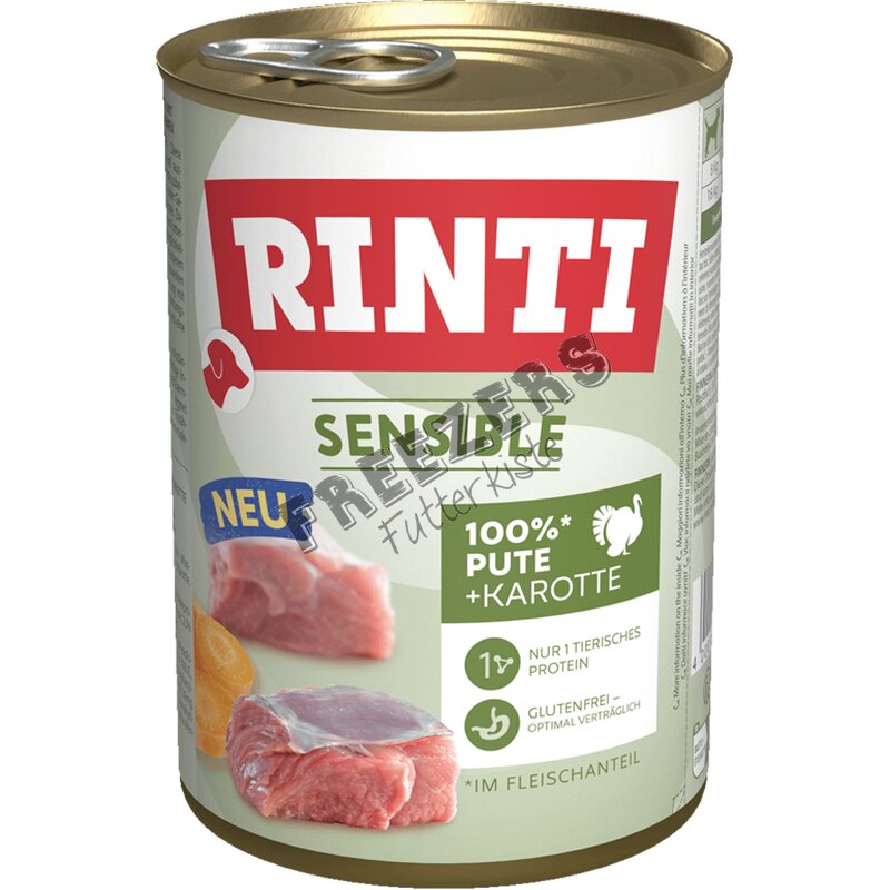 FÜR EMPFINDLICHE HUNDE MIT VERTRÄGLICHKEITSPROBLEMEN · AUSGEWÄHLTE PROTEINE: Diese hochwertige Vollnahrung wird ausschließlich mit Pute und Karotte zubereitet. Keine weiteren Fleisch- oder Getreidesorten, bzw. Kohlenhydrate. Dadurch kann sich das Risiko von Futtermittelallergien und -unverträglichkeiten reduzieren, die sich unter anderem auf die Haut und das Fell auswirken können. Durch die Anreicherung mit Karotte verbessert sich die Nahrungsverwertung, Kohlenhydrate sind eine fettarme Energiequelle. GLUTENFREI: Durch den vollständigen Verzicht auf glutenhaltige Inhaltsstoffe, die zu Magen- und Darmproblemen fu¨hren können, eignet sich Rinti Sensible auch zur Ernährung von Hunden mit Glutenintoleranz.