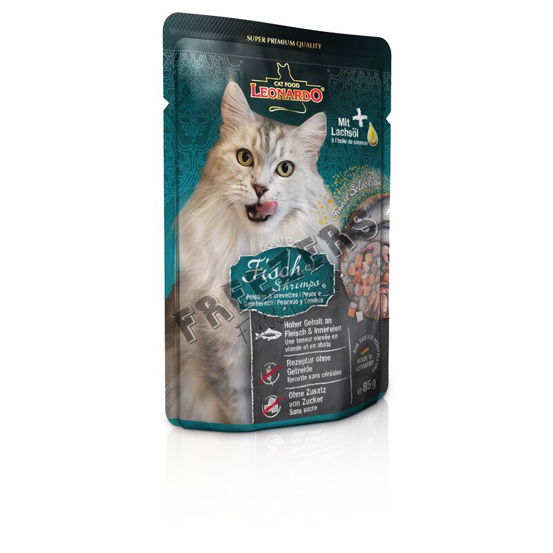 Lachs (30 %); Brühe vom Hering, Lachs, Shrimps (29,3 %); Hering (18 %); Shrimps (12 %); Geflügelleber (10 %); Mineralstoffe (0,5 %); Lachsöl (0,2 %)