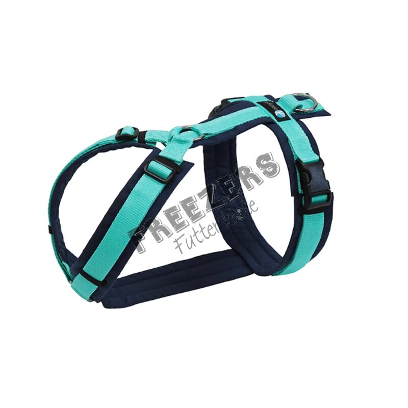 Die umlaufenden Gurte im Brustbereich bilden dank des langen Unterbruststegs einen bewegungsfreundlichen Abstand zu den Vorderbeinen, so dass die Achseln geschont werden. Das Gurtband ist in der kleinsten Einstellung komplett mit luftdurchlässigen Schaumstoff gepolstert und dieser wiederum ist mit Cordura (hoch abriebfestes Material) eingefasst.