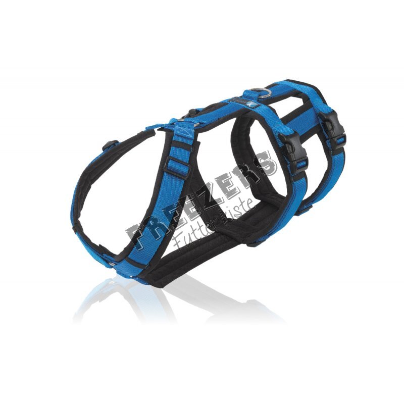 Es ist im Hals-, Brust- und Taillenbereich individuell einstellbar und zwei Steckschnallen sorgen für einen bequemen Einstieg. Das Geschirr ist so aufgebaut, dass es sich dem Körperbau des Hundes ergonomisch anpasst, dadurch entsteht eine optimale Zugverteilung, die den Rücken Ihres Hundes schont. Voraussetzung hierfür ist, dass die Leine ausschließlich an dem dafür vorgesehenen Leinenring eingehakt wird. Wir raten grundsätzlich davon ab den Karabiner der Leine an einem der anderen, vorderen Ringe einzuhaken, da sich das Geschirr verzieht und das Gurtband einem erhöhten Verschleiß unterliegt. Die umlaufenden Gurte im Brustbereich bilden dank des langen Unterbruststegs einen bewegungsfreundlichen Abstand zu den Vorderbeinen, so dass die Achseln geschont werden. Das Gurtband ist in der kleinsten Einstellung komplett mit luftdurchlässigen Schaumstoff gepolstert und dieser wiederum ist mit Cordura (hoch abriebfestes Material) eingefasst.